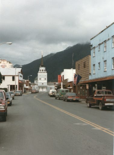 This is downtown Sitka, and St. Michael Cathedral National Historic Landmark built from 1844 to 1848 by Bishop Innocent Veniaminov on Lincoln Street. Home of priceless original icons and paintings of the Czarist days.