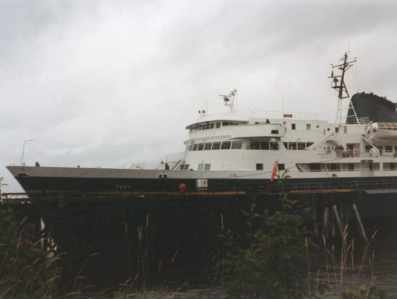 The M.V. Le Conte at Tenakee Springs, the length of the ship is 235 feet and carries 250 passengers and 47 vehicles.