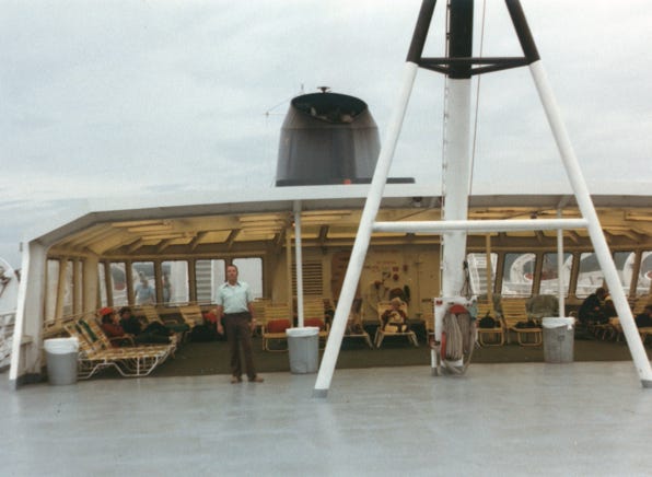 Now as the ship was sailing away, Nancy was in the lobby of the ship and we were heading north to Prince Rupert, B.C. Bill was on the deck and the solarium area of the ship.