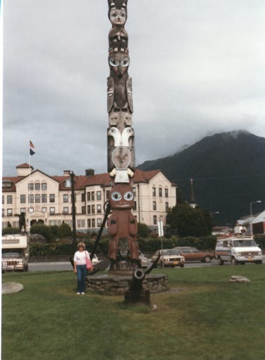 Nancy is on the deck of the M.V. Matanuska in the Wrangell Narrows. As we approach Wrangell, it is on Wrangell Island. Wrangell began as a fur trading post in 1834, and since that time has thrived under three different flags, Russian, English, and American. The population is 2,300 and the annual rainfall is 72 inches a year.