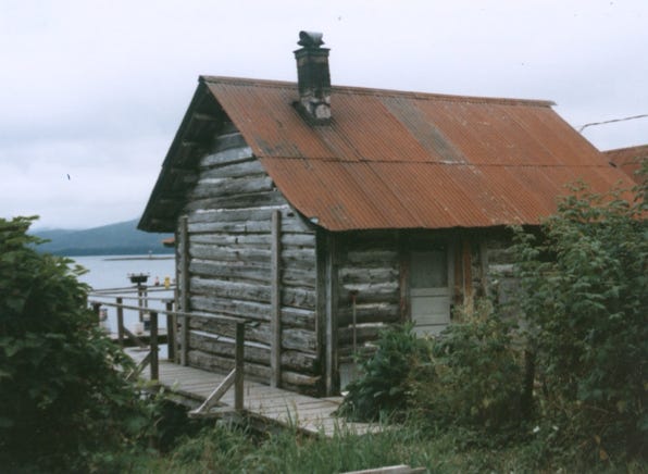 A log cabin on the shoreline of Tenakee Springs.