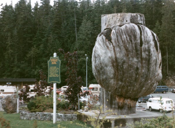 We drove north to Port Hardy, B.C., and waited in line to board the M.V. Queen of the North at an area by the ferry terminal. The M.V. Queen of the North is 410 feet long and a beautiful ship. As many of us waited to drive our rigs onto the ship we took a photo of the “Sitka Spruce Burl.” It is 30 feet in diameter and weighs 7 tons, located next to the ferry terminal.