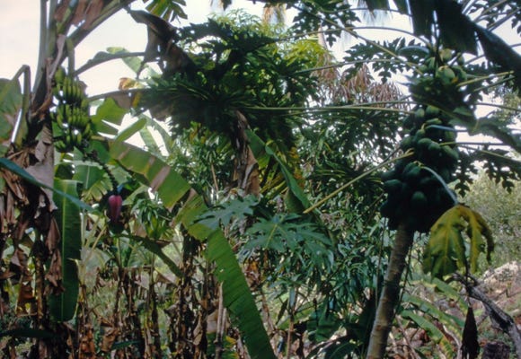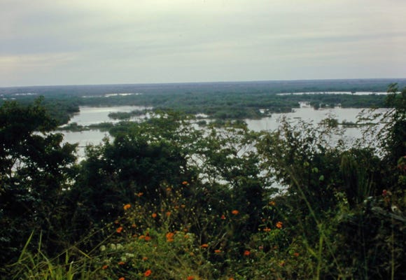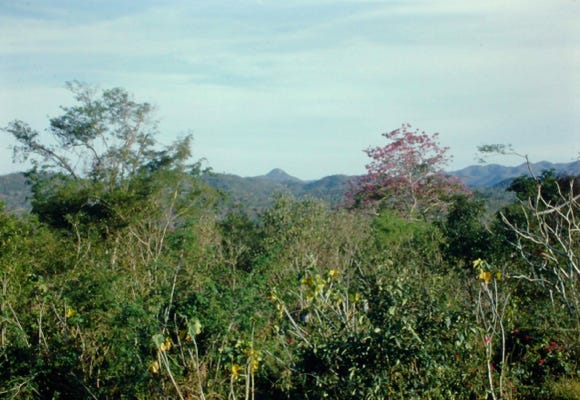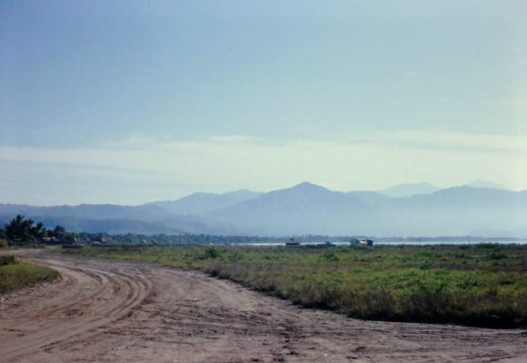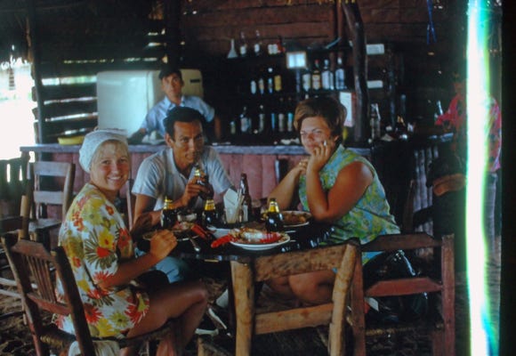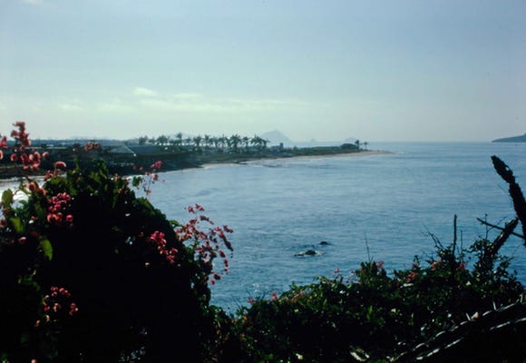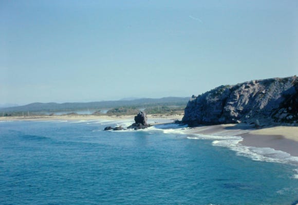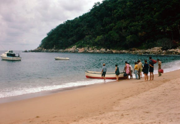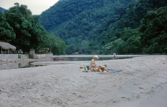 At that time the road was a dirt road and we had to forge a stream to get to Boca. A view from the road of Boca de Tomatlan and our dune buggy with Lady and Nancy. Several views of the bay and wild orchards. We brought our lunch and while Bill was fishing for bonefish, Nancy and Lady were relaxing on the sand spit. Bill had luck and caught a nice bonefish.