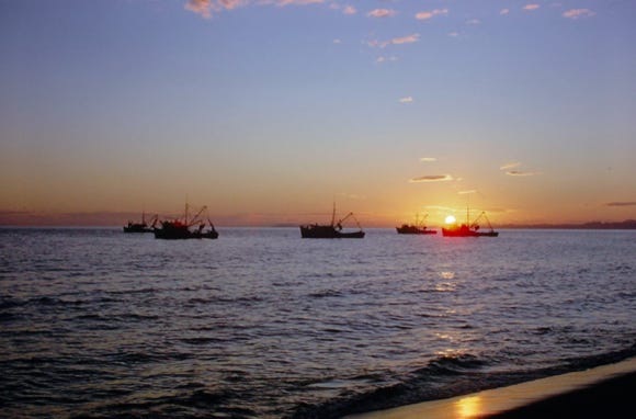 A fleet of shrimp boats on the Sea of Cortez and a view of Tiburon Island. As we drive through the area we see a house built by a Seri family, we bought a hand-carved ironwood crab from the family and still have it today. Along the shoreline, you can see many RV’s parked to spend the winter.