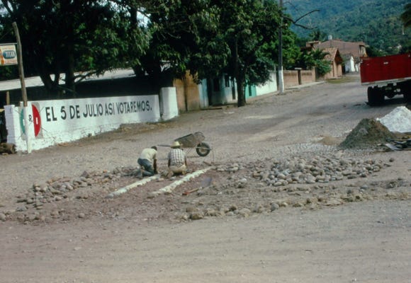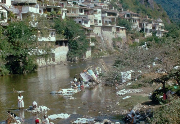 We arrived at Puerto Vallarta and found a nice RV park to stay at. We drove into town to explore the area and took our laundry to a local laundromat. Nancy was going to do the laundry, but they said to leave it there, and they would wash and fold our laundry and we could pick it up in a few hours. We walked around downtown and the marketplace and saw men laying cobblestones repairing the street. We picked up our laundry, neatly folded for only $5.00 US money. A photo of the locals doing their laundry in the Rio Cuale.