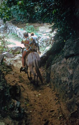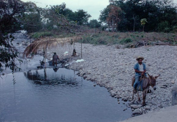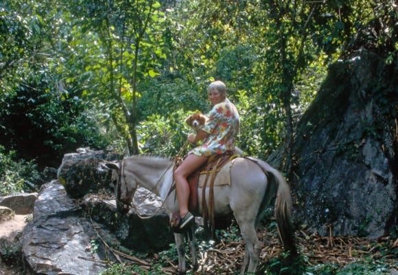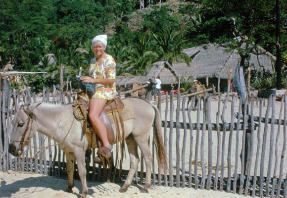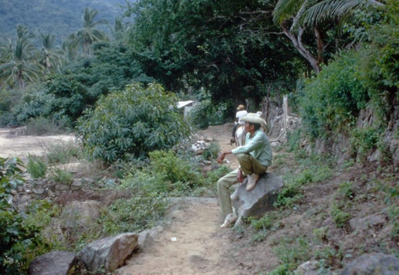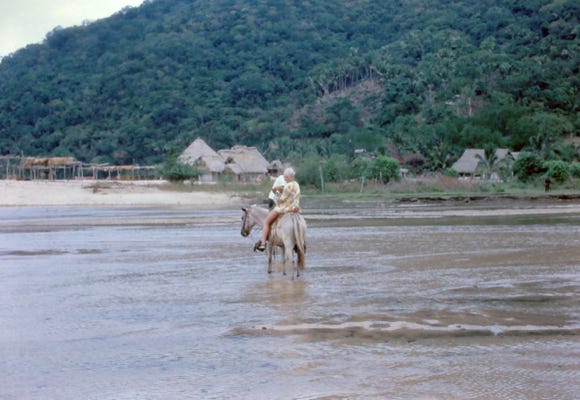 The three of us sitting under a Palapa enjoying some moonshine called “Raicilla,” made from the maguey plant is 100 proof. We took a burro and rode up along the El Tuito River to see two impressive waterfalls and took a swim. Nancy kept Lady straddled on the saddle as Bill was taking pictures. We passed a small home where a woman was making corn tortillas by hand, and we ate several of them.