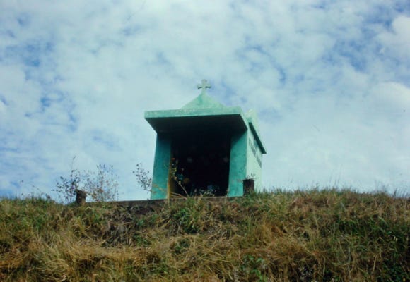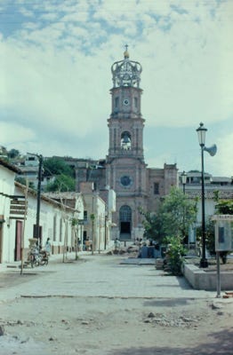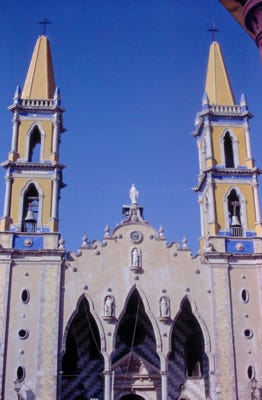 Leaving Mazatlan on Highway 15 a photo of a church in Mazatlan, and a village called San Miguel. We are driving south to the quaint town of San Blas. Along the way is a green shrine, an old Alamo, and a church. Another village along the San Cristobal River and to the plaza at San Blas.