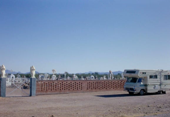 Entering Nogales we took a photo of the famous statue “Mono Bichi” killing an eagle, then driving along Highway 15 south to Hermosillo we passed by some young boys with their burro, and a group of kids selling their red peppers. This is the church of Santa Maria Magdalena in Magdalena de Kino, a cemetery before the town of Santa Ana, and then to the town of Hermosillo.