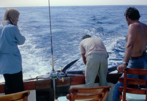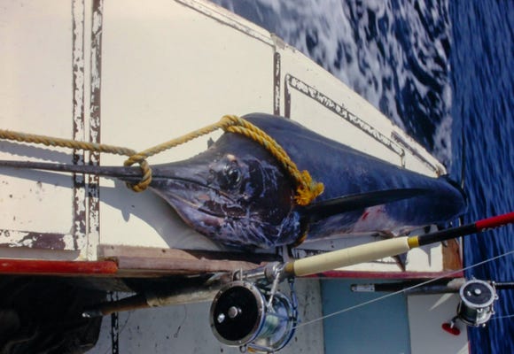 The next morning we got up early and took a taxi to where the fishing boat was docked and off we went. We trolled all day and it was slow fishing, but then as Christopher was sitting in the chair the line spun off of the reel, and he had a fish on. It was a large Sailfish, and he brought it up to the boat and the crew gaffed it and brought it on board.