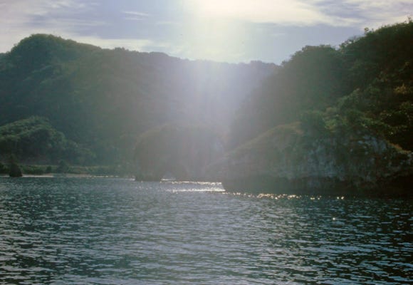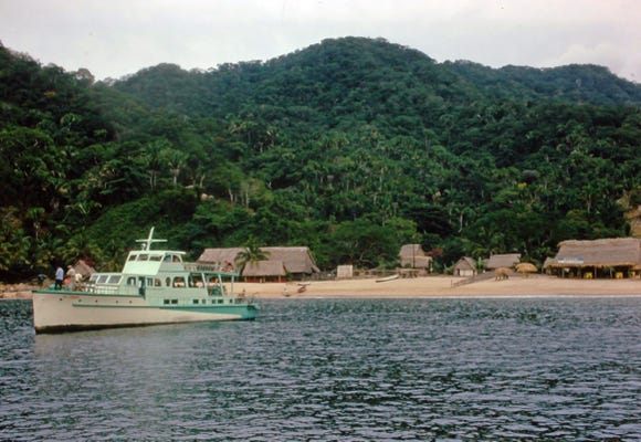 A view from the boat of the large rock formation called Los Arcos De Mismaloya, and photos approaching the bay of Yelapa. The boat was anchored off shore and a skiff took us onto land.