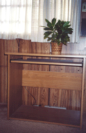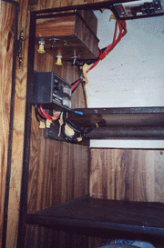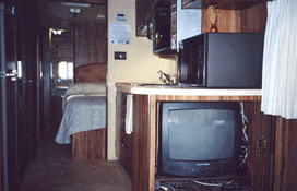 Also, in the cabinet is a 40-channel CB, 600-watt Heart Interface Inverter, space for a Satellite Receiver with all cables for the TV, VCR, AM/FM Stereo System, a Weingard Antenna with a 12-volt booster, two 12-volt fans to cool all the components in the TV cabinet. We also have two stereo speakers for listening to music when sitting outside controlled by a 3-way switch mounted in an inside cabinet.