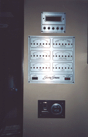 We have five Arco Solar panels mounted on the roof that are adjustable for tilting towards the sun along with a controller unit that shows amps of charge and battery voltage. Mounted outside on the air conditioner housing is a yellow 12-volt strobe lite that goes on when the burglar alarm goes on. The burglar alarm controls are mounted in the same cabinet along with the solar panel controller. The alarm system is wired to every outside compartment door as well as the front door and the screen door insert, the two battery boxes are also wired to the alarm system to protect the batteries. We also have a separate switch that you can pull from inside the trailer to make the alarm go off on its own to scare away intruders. Also, in the living room, you can select a wall switch to put on scare lights that light up all around the trailer at nighttime.