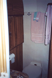 From the bedroom area is the large rear bathroom with double wardrobe closets, a large tub, and a shower. The bathroom sink is very large with two drawers and a compartment for more storage. We have installed a new Sealand China Bowl Toilet with a hand sprayer, and have replaced the 6-gallon water heater that is glass-lined.