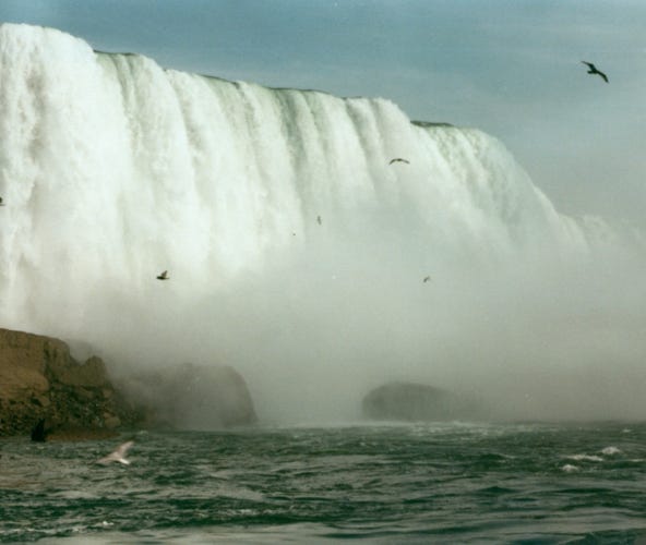 This is an aerial view of the Canadian Horseshoe Falls and American Falls which are situated 20 miles from Lake Erie and 14 miles from Lake Ontario.
