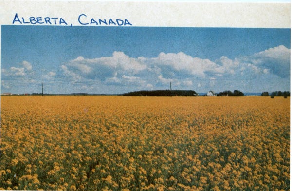 Leaving the area we are on Canada Highway 1 taking us across the country to the East. As we are driving the area we see many fields of ripe canola flowers at Grande Prairie, Alberta.