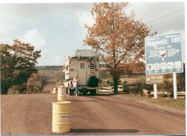 We left the area and are towing our trailer to Moncton, New Brunswick, Canada. Again, we unhooked the trailer at Moncton so that we could see the famous “Magnetic Hill.” This is an example of a gravity hill, a type of optical illusion created by rising and descending terrain. You pay a small fee so that you can test and see your car going uphill.