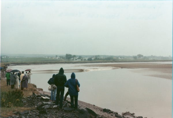A tidal bore in Truro, here you can see the wave approaching us on the shoreline.