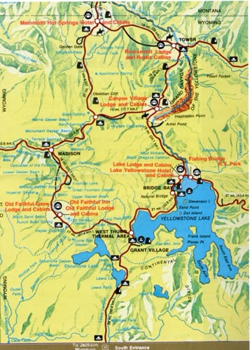 A view of the Grand Tetons on our way to Yellowstone Park. A map of Yellowstone National Park. Yellowstone National Park is located in Wyoming, Montana, and Idaho, and was established in 1872, and the first national park in the U.S.