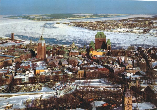 The above is a postcard of an aerial view of Quebec City in the winter and several photos of downtown Quebec. Bill and Nancy went to an outside cafe for lunch, and we felt like we were in Paris.
