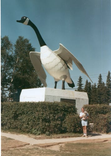Here, I am with Bill in Wawa, Ontario. Wawa means “Wild goose,” in Ojibway. This is sculptured in steel and stands 28 feet high, and is 22 feet from the beak to the tail with a wingspan of 19 feet, and weighing over two tons.