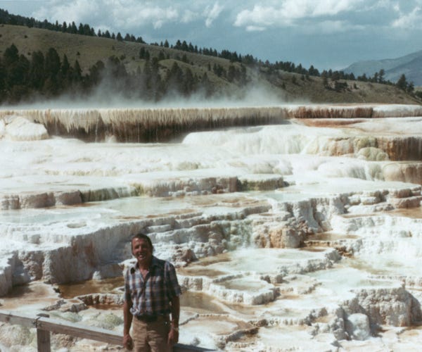 Bill is standing on a walkway with Mammoth Hot Springs in the background. With more, than 700,000 gallons of water and two tons of limestone pouring out each day as the tiers steadily grow.