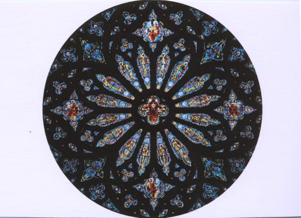 An aerial view of the New York Skyline, and a high-rise building with the twin towers in the background. We stopped and toured the “Cathedral of Saint John the Divine,” construction began around 1892. A postcard of the great rose in the West front takes its acknowledged place among the great windows of the world. It is 40 feet in diameter and contains over 10,000 pieces of glass.