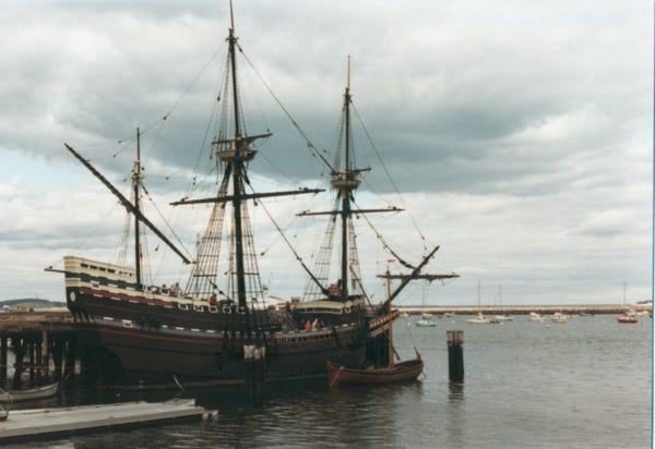 Driving on Highway 106 we parked the trailer at Normandy Farms Trailer Park so that we could drive to Plymouth, Massachusetts to see Plymouth Rock. On a two-lane road, we stop to see the replica of the 17th-century ship Mayflower II. The replica was built in Devon, England during 1955-1956. It is located at the State Pier in Plymouth, Massachusetts.