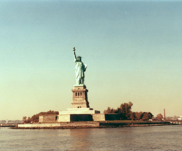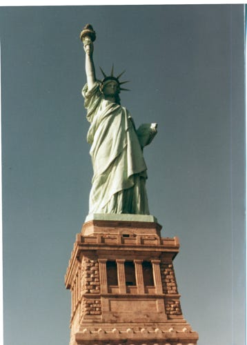 On the boat, we are approaching the Statue of Liberty, with a height from the foundation to the top of the torch at 305 feet, it weighs over 200 tons and has a total of 354 steps to the viewing platform in the crown. Well, we did it, we climbed the steep steps that are only 19 inches wide, with a head clearance of 6 feet 2 inches. This climb is strenuous and is equivalent to 20 stories.