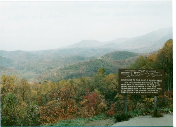 This photo shows mountains to the East and South-East. All of the mountains visible from here are to the North of the main Great Smokies Range. On the Tennessee side of the National Park, the mountains rise fully a mile above its base. From Greenbrier Pinnacle to Sugarland Mountain.