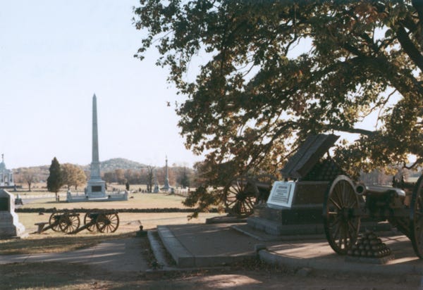 Next, you will see the 60-foot-high Soldiers National Monument where the first cornerstone of the monument was laid on July 4, 1865, and it was finished and dedicated on July 1, 1869. On November 19, 1863, President Lincoln delivered the Gettysburg Address.