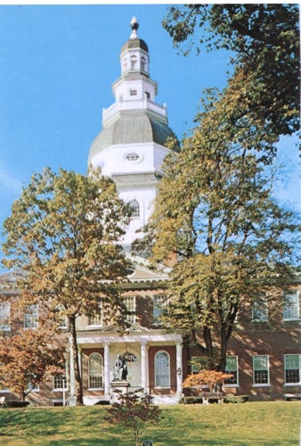 A postcard of Maryland’s State House in Annapolis, Maryland built in 1772 serves as the seat of the State Legislature and is the oldest such structure in America still in daily use.