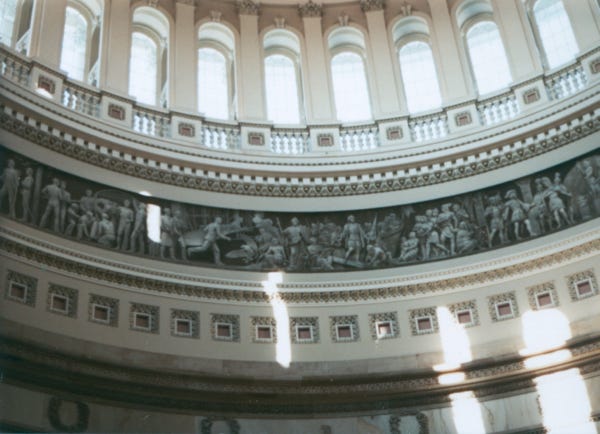 Now, it was time to hook up the trailer again and drive to Washington, D.C. We found an RV park outside of town that offered a van to take visitors to the Capitol Building and many other historic sites. A view of the Capitol building and the Capital Dome with the American flag, and inside the Capital Building.