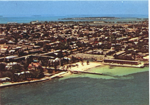 This is a postcard explaining and showing the old southernmost house and the new southernmost house on the southernmost point of land in the continental United States. This is also the South end of Duval Street, the “Longest Street in the United States,” going from the Atlantic Ocean to the Gulf of Mexico. South Beach, which is also the southernmost beach, and South Beach Motel Row are in the background.