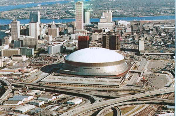 An aerial view of the Superdome in New Orleans, and a view inside the dome. We walked the St. Louis Cemetery where all of the graves are placed above the ground because of ground water.