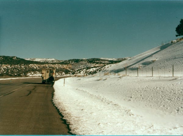 Leaving on March 4th, for our annual ski trip we are on Highway 89 to Cove Fort, Utah passing an old log cabin, and then on Highway 70 going to Green River, Utah. Arriving at Aspen Mountain and skiing there we then went to Aspen Highlands and parked our rig in the parking lot next to the Aspen Highlands Inn.