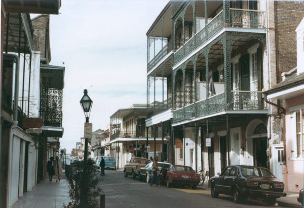 Another view of the French Quarters and a Cornstalk Fence, which is a painted row of iron cornstalks in front of 915 Royal Street.