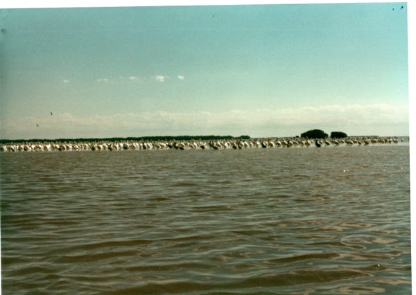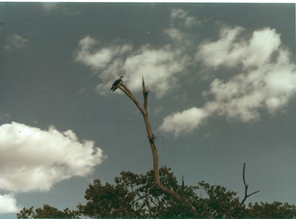 We got a canoe and paddled along the shoreline of the park and saw many brown pelicans on a sandbar. As you can see sitting on the tree limb another Blue Heron, and a large Osprey.