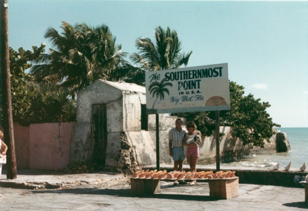 Here are the three of us at the Southernmost point in the United States in Key West, Florida. Bill and I standing by a sign that reads only 90 miles to Cuba with sponges and conch shells on the ground. We had a great time in Key West, bought several pairs of handmade sandals, and then it was time to head north.