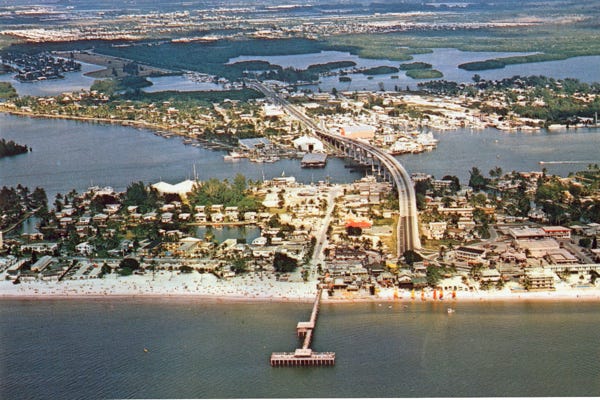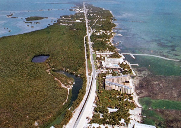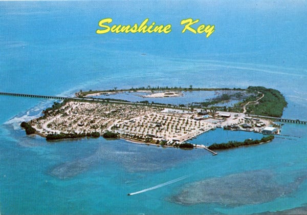 More aerial views of Marathon Key taken from Sombrero Beach, show the Country Club sailing yacht basin, and golf course. Then to Bahia Honda State Park, and over the seven-mile bridge that goes to the sea for 150 miles. Now at the Sunshine Key and an RV park on the key.