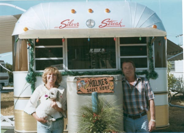 Nancy and I on Christmas Eve at the park, everyone put a candle in a paper bag in front of the rigs to light the path as people walk the area during the night. Our Christmas photo is in front of our trailer at Fort Meyers.