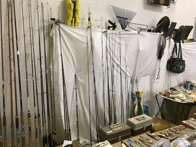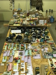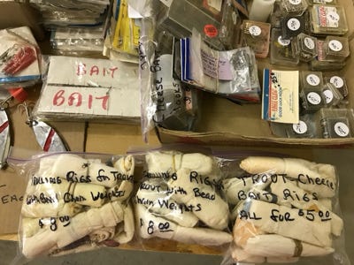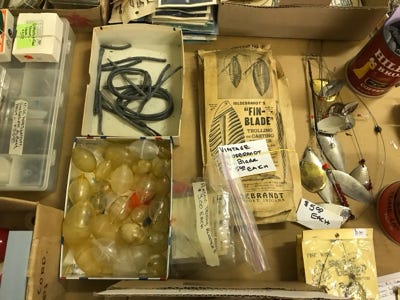 We have fifteen fish stringers of various lengths, a small anchor with a weight, several small minnow nets, plastic aprons, seven red hook removers, several knives and scissors, several stones to sharpen hooks, a compass, a worm threader, several bells for tying on the end of a rod when bait fishing from the shore. Many reels and boxes of line, and two boxes of leaded line. Two rubber rod holders to mount on a wall to store fishing poles, a rattlesnake kit, and some metal clamps.