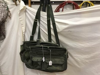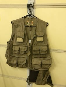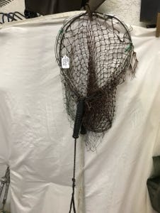 We have two fly vests, one size is small and one size is medium. We have two Danielson Fishing Creels and two hand-fly fishing nets. One of the nets is a Vintage 1950s Collapsible hand net, and the other is a hand net made in aluminum. We have three other nets, one is a long-handle bait net, one is a small aluminum net used for small fish, and the other one is a larger net with a collapsible handle that we use for salmon fishing.
