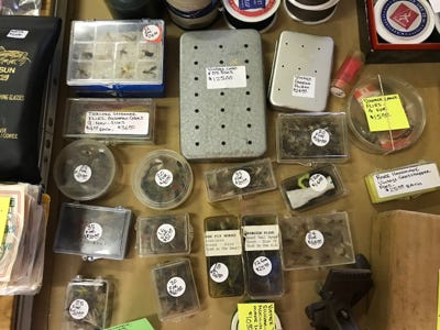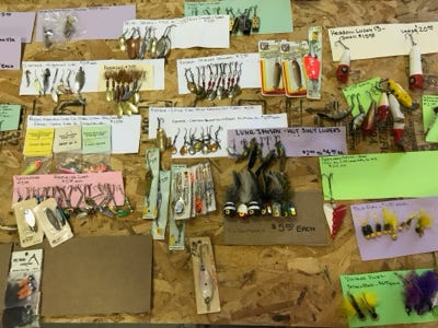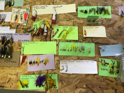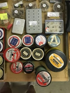 We have counted in all of the boxes, 589 flies, some are wet or dry flies, some are hand-tied, and some are machine-tied, some we got in Yellowstone National Park, and others from all over the country. We have other vintage flies, bug flies, and small trout poppers to list a few.