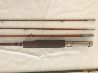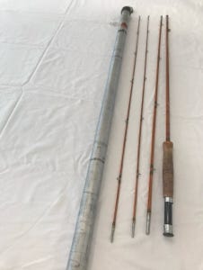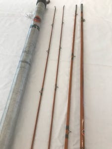 Montague Fishkill - 9’, 3 pieces with 2 tips, split bamboo, rated one of the top five fly rods, excellent condition. This is a rare find, the rod is in a metal tube dated May 15, 1931.