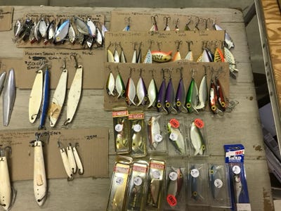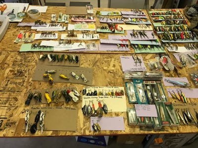We have hundreds of lures from bass, crappie, walleye, trout, corvina, tuna, marlin, salmon, cod, halibut, redfish, and many more. To name a few of the lures that we have are Bomber wooden lures with a screw and Luxon line tie, Bomber plastic lures, Bomber plastic Waterdog lures, and Buckeye Bait Company Mad Minno to name a few. While we have counted all of the lures you see in the photos, we have tried to be accurate in the number of lures that we have.