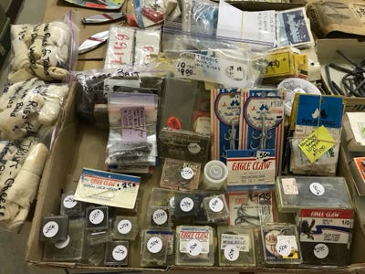 Bags of leader material, Vintage Erwin Weller Leader in original package (18 to 20 pounds), Allcock Hooks with Leaders - Made in England in original package, Cod rigs in original package, packages of steel leaders, many boxes and bags of assorted hooks, Mustad hooks, Eagle Claw hooks, stainless steel hooks, treble hooks, tube and flathead jig heads, large single hooks with leader material in various sizes, ball bearing snap swivels, quick clip snap swivels, barrel swivels, split rings, cigar snap swivels, nylon coated wire leaders.